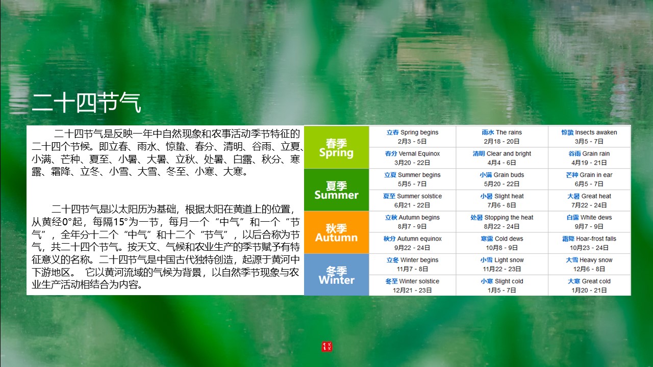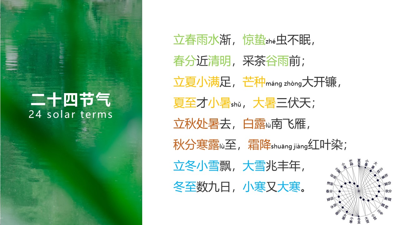 诗会以二十四节气为主题延伸二十四首诗歌(古诗为主),诗歌选取注重体现节气特色。